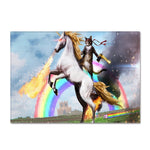 Paillasson humoristique d'un chat chevauchant une licorne cracheuse de feu